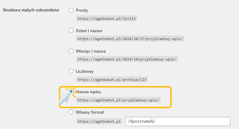 Domyślnie, po instalacji WordPressa, odnośniki są ustawione na format prosty. Jest to mniej optymalne dla SEO, dlatego warto je zmienić na „Nazwa wpisu”.