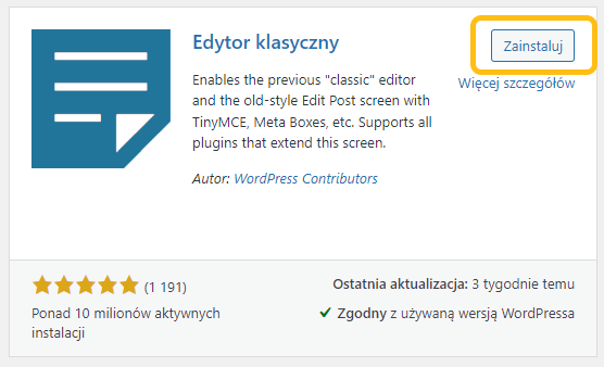 Po znalezieniu wtyczki kliknij „Zainstaluj”, a następnie „Aktywuj”.