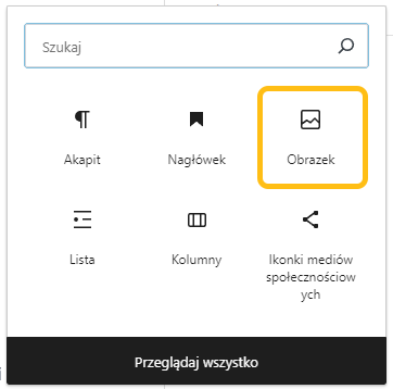 Kliknij „Dodaj blok” (plusik), a następnie wybierz blok „Obrazek”.