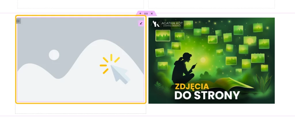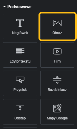 W panelu po lewej stronie odszukaj blok „Obraz” (znajdziesz go w zakładce „Podstawowe”), a następnie przeciągnij go na wybraną część strony.